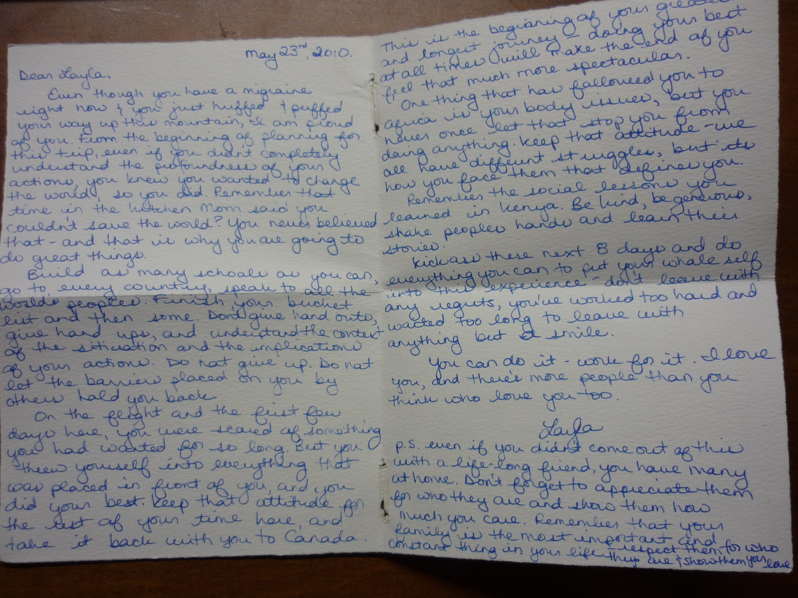 In Kenya, in May 2010, we were told to write a letter to ourselves. We received them unexpectedly in the mail almost a year later. While this is probably one of the most personal things I’ve ever written (most likely because it was to myself for my eyes only), I found it today and find it to be the best reminder I could have asked for in such a transitional time.